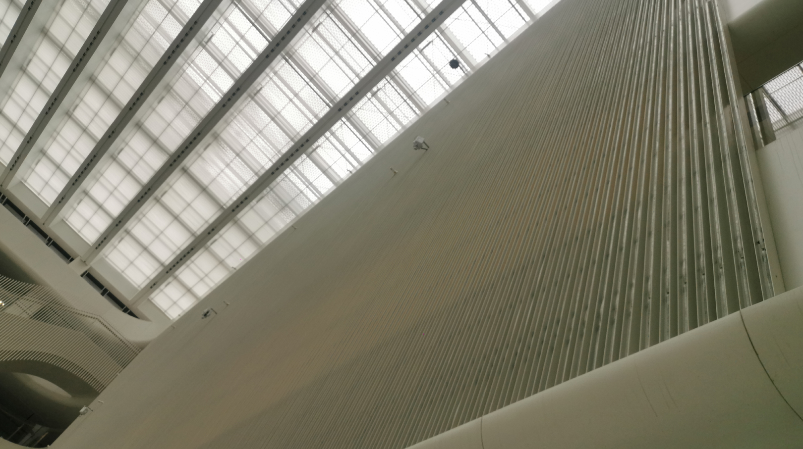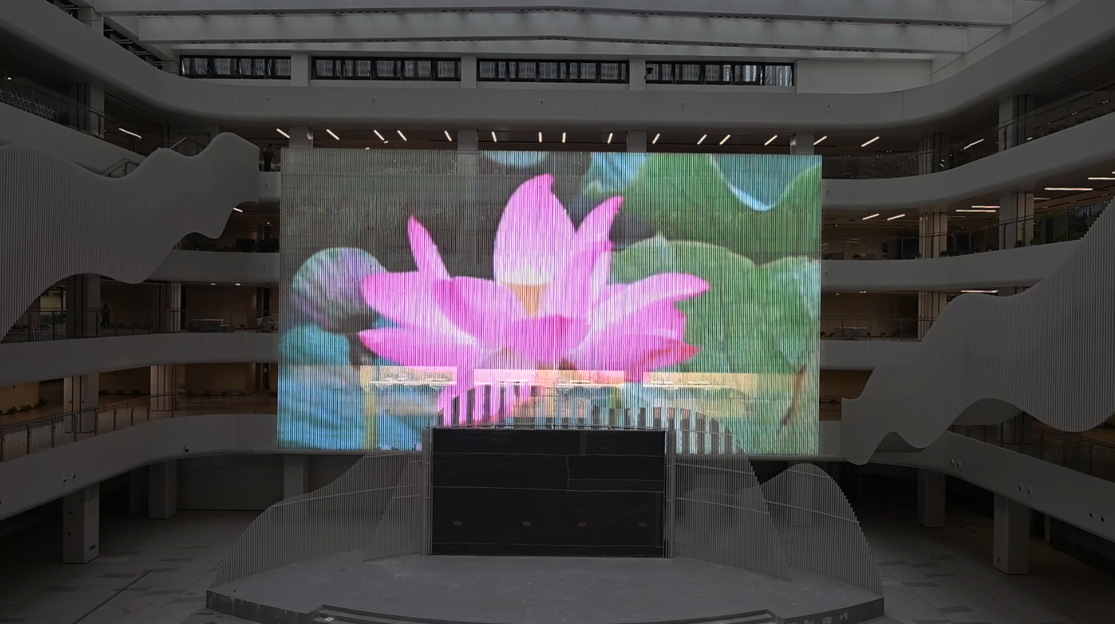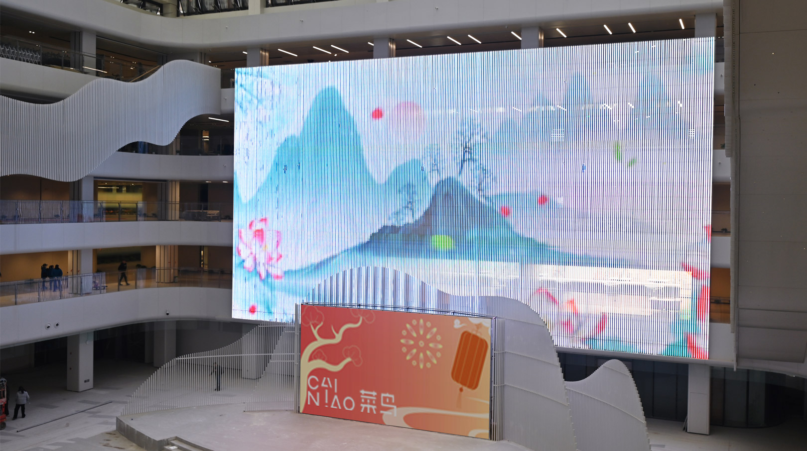 阿里菜鸟全球总部室内媒体屏尺寸为28米*15.5米,采用每米10个像素点的一体化防水灯带约5000米,安装在竖向的280根铝合金方管上