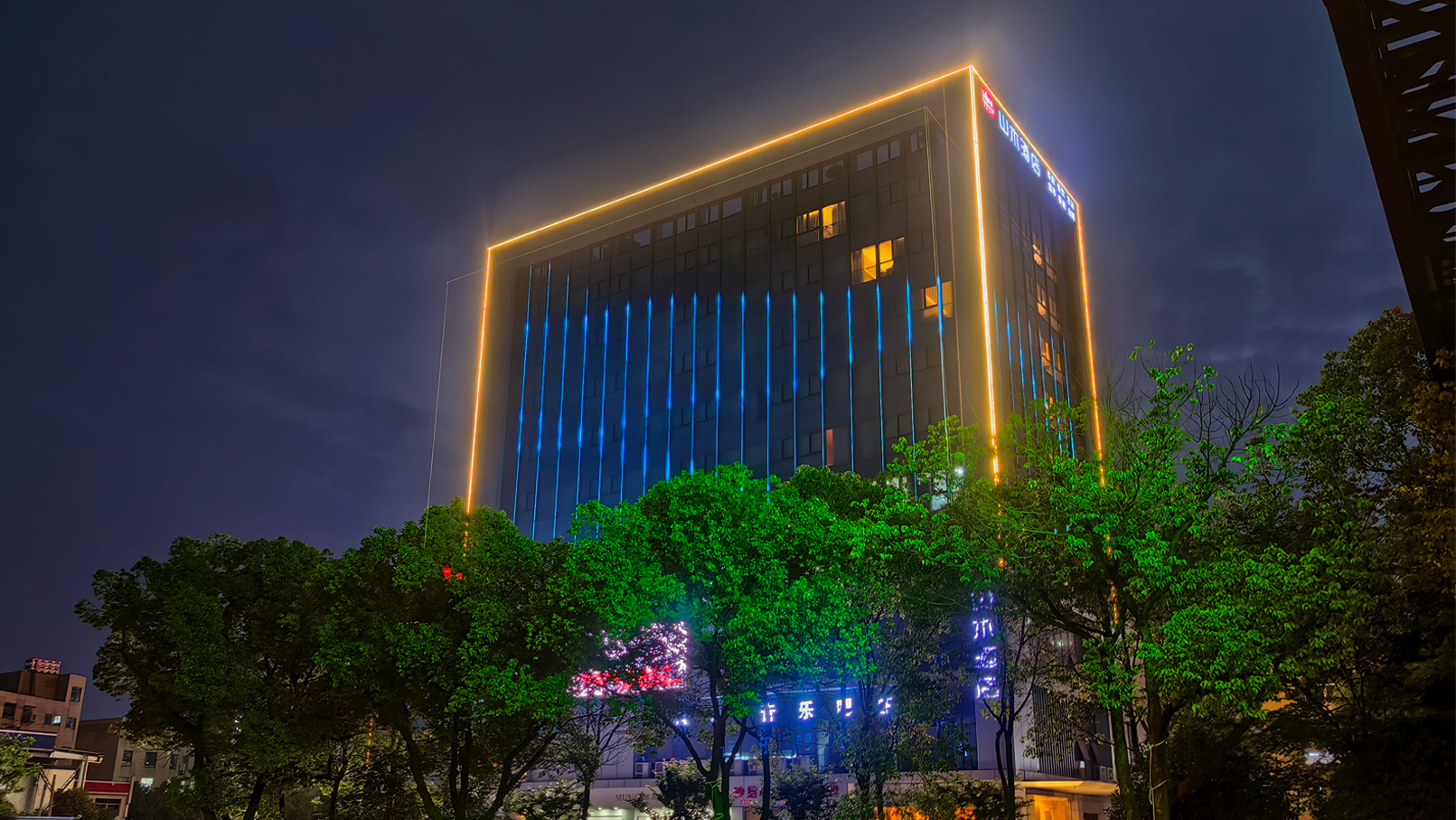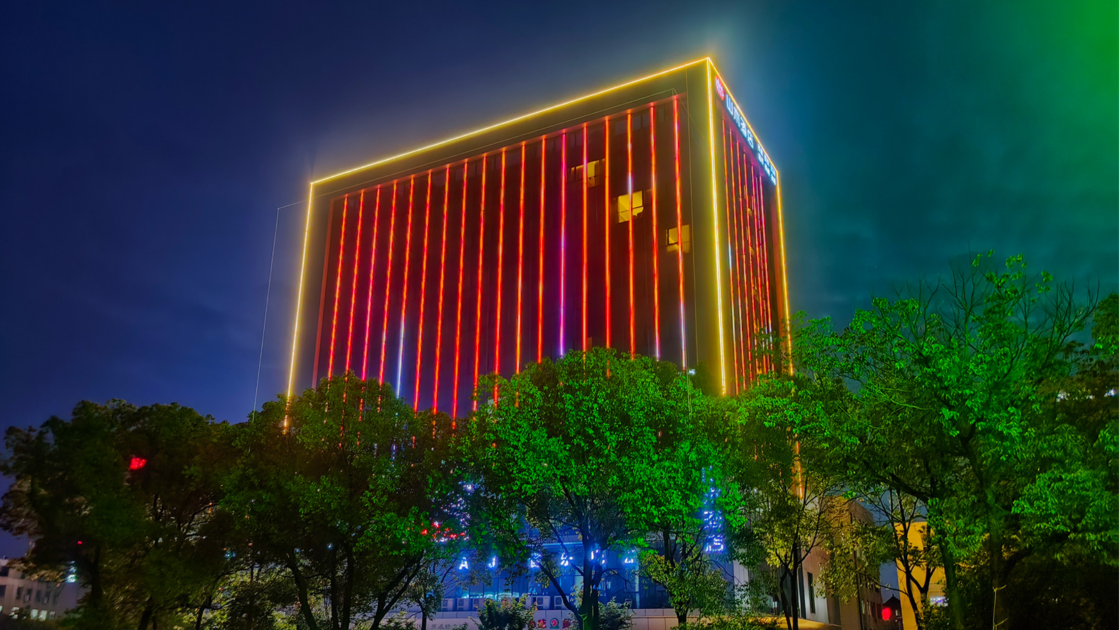 A 700-meter IP68 colorful soft light strip is linked to the curtain wall pixel screen, and a warm-colored constantly-on light strip is used to outline the building contour. The combination of dynamic and static effects creates a global lighting solution with "low cost, excellent effect and easy replication".